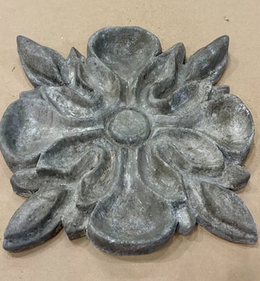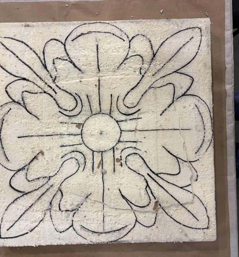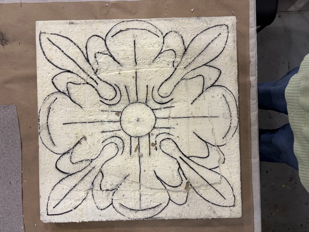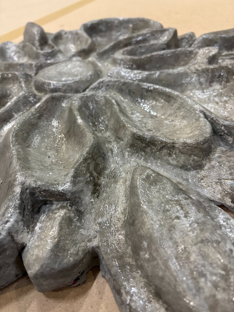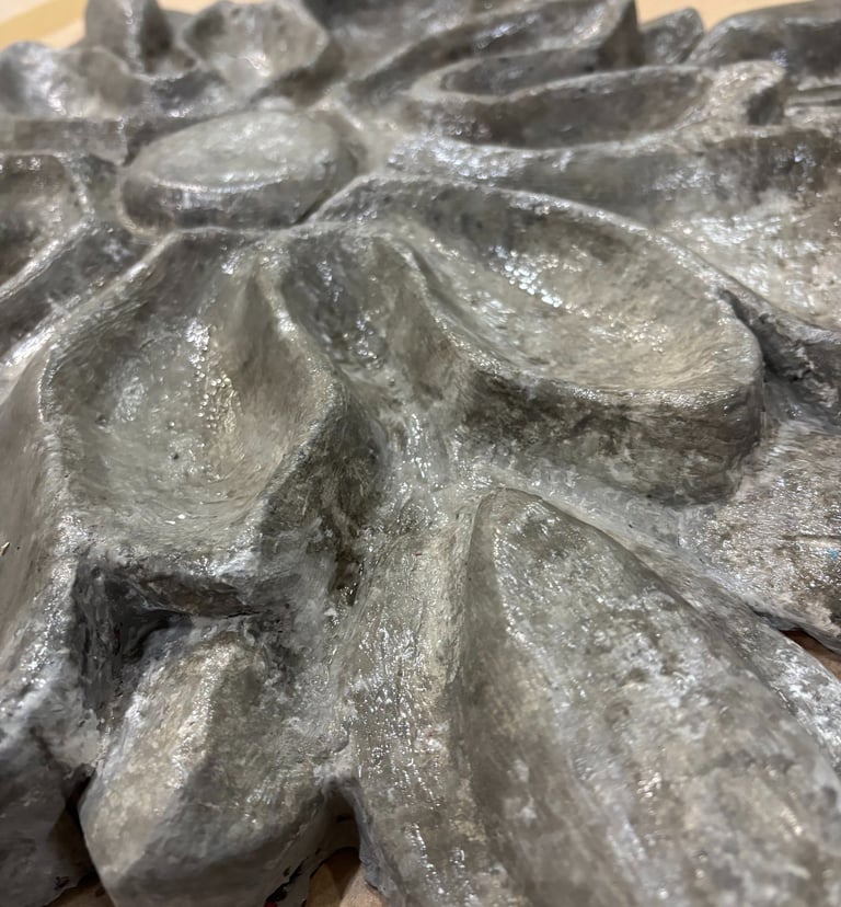 Carved foam, pvc pipe, elastomeric sealant, ground coconut fiber paste, recycled drop ceiling tile, paint faux finish